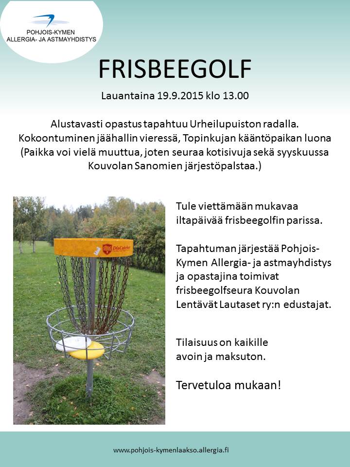 Tule tutustumaan frisbeegolfin saloihin. Opastajina toimivat Kouvolan Lentävät Lautaset ry:n edustajat.