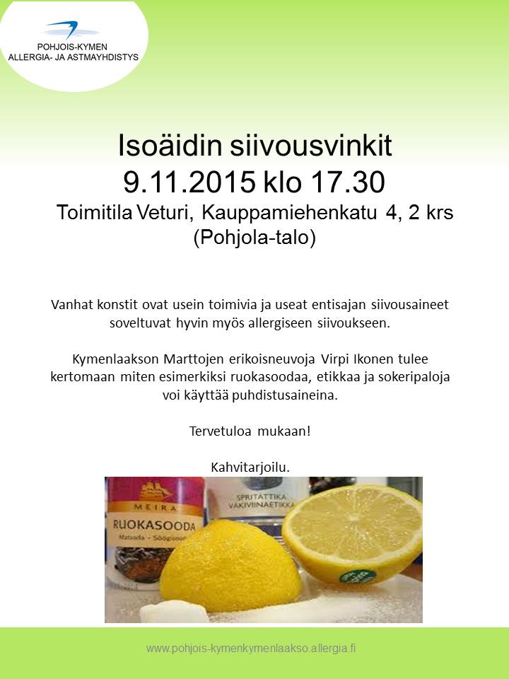 Kymenlaakson Marttojen erikoisneuvoja Virpi Ikonen tulee kertomaan miten esimerkiksi ruokasoodaa, etikkaa ja sokeripaloja voi käyttää puhdistusaineina.