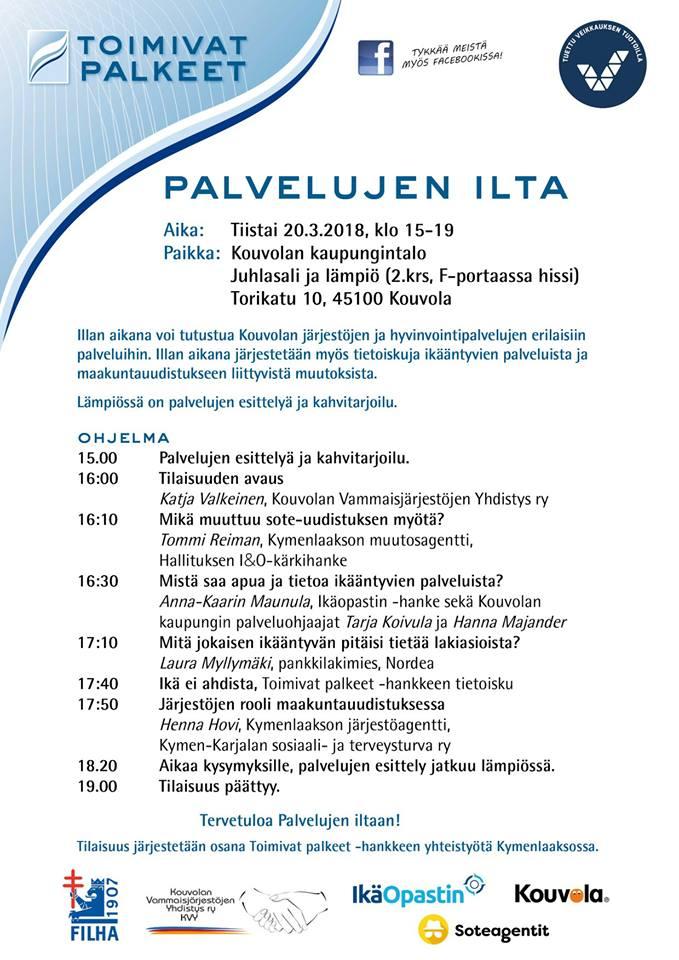 Toimivat palkeet -hanke järjestää yhteistyössä Kouvolan Vammaisjärjestöjen Yhdistys KVY ry:n, IkäOpastin- ja Soteagentit -hankkeiden kanssa Palvelujen ilta -tilaisuuden. Tapahtuma on suunnattu kaikille ikääntyville.